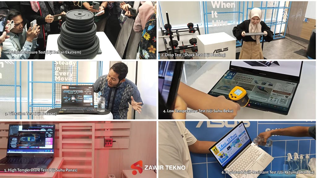 Total ada 7 booth yang disiapkan di sana, dan jujur aja, 6 di antaranya adalah murni booth “penyiksaan” standar militer (MIL-STD 810H). Dari sinilah gw sadar, ASUS nggak sekadar jualan spesifikasi, melainkan memberikan ketenangan pikiran lewat durabilitas kelas militer yang tak tertandingi.